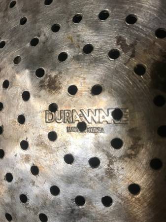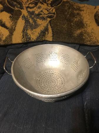 DURAWARE brand commercial aluminum collander. 16 quart, 17.25 inches Well used but very sturdy. In broken bow, Ne. I do travel east nebraska occasionally. A few other restaurant equip. available....