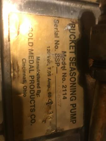 GOLD MEDAL brand seasoning bucket pump. 110 volts. NO CORD. Pickup or actual freight+$10 packaging. Guaranteed to work or money back. Buyer pays return shipping. In Broken Bow, Nebraska. Lots of...