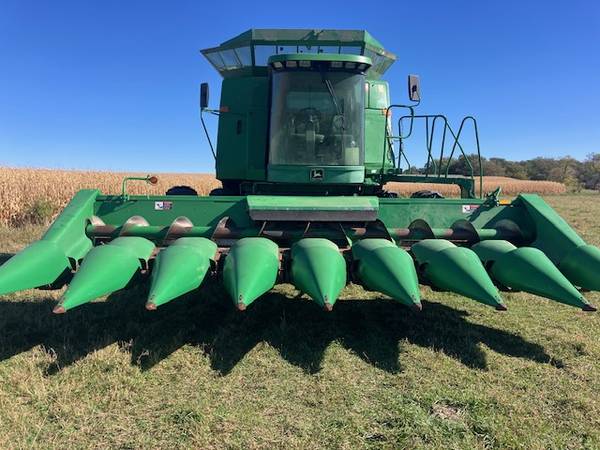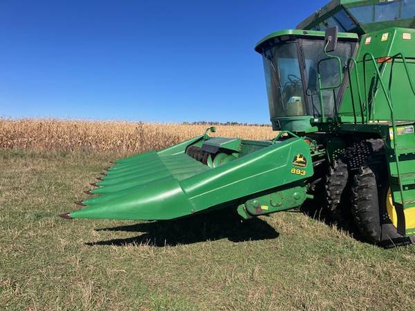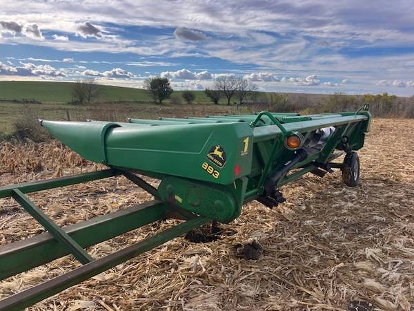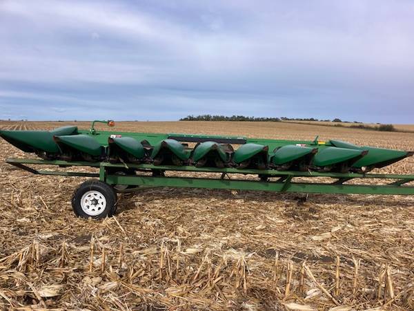 8 row 30". All new gathering chains, poly snouts, nice header trailer included.